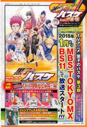 Dalam pengumuman yang dimuat dalam majalah komik terbitan Shueisa tersebut, musim ketiga Kuroko no Basket akan mulai tayang pada bulan Januari 2015 mendatang. Majalah komik edisi ke 49 tahun 2014 tersebut juga memuat visual key dari musim ketiga Kuroko no Basket.