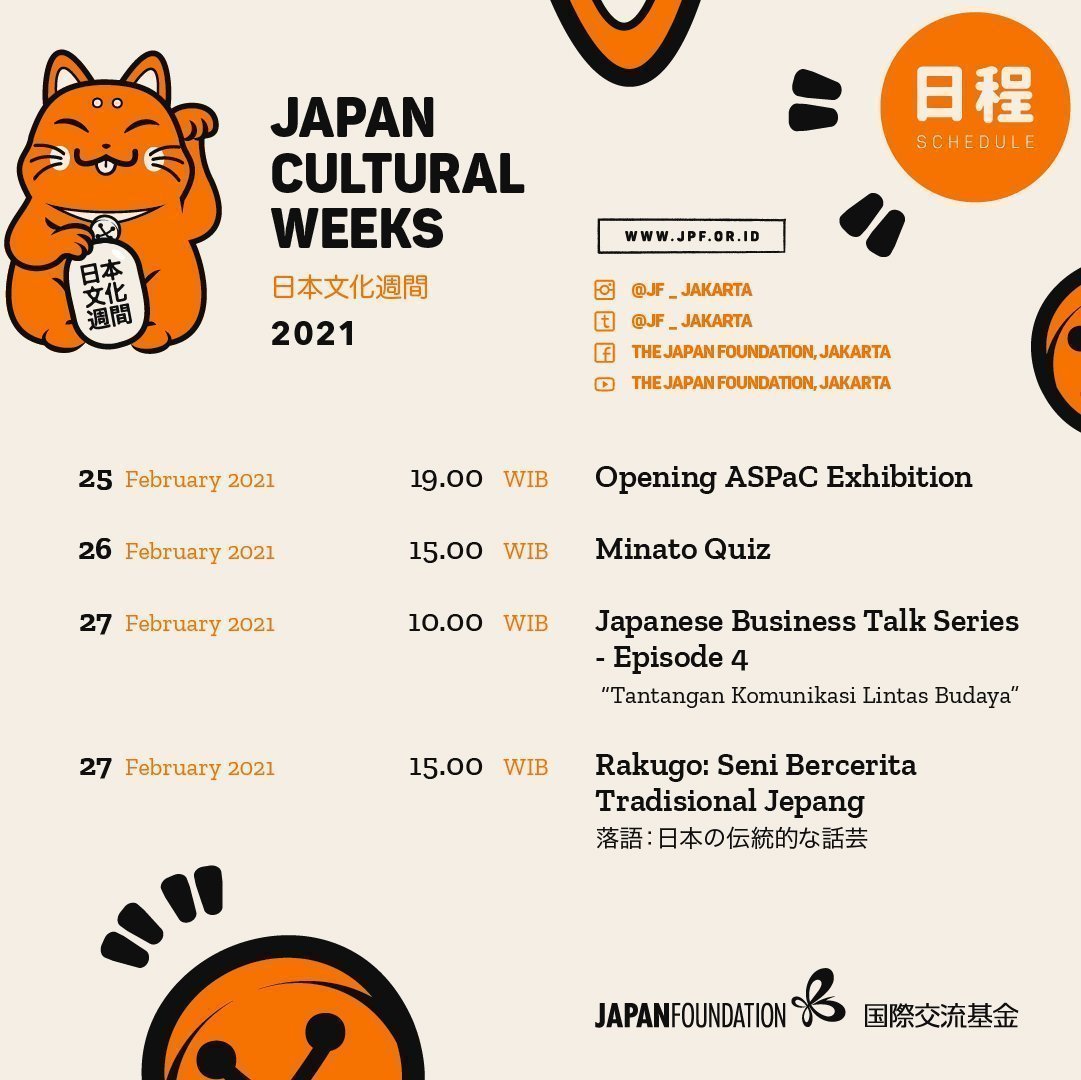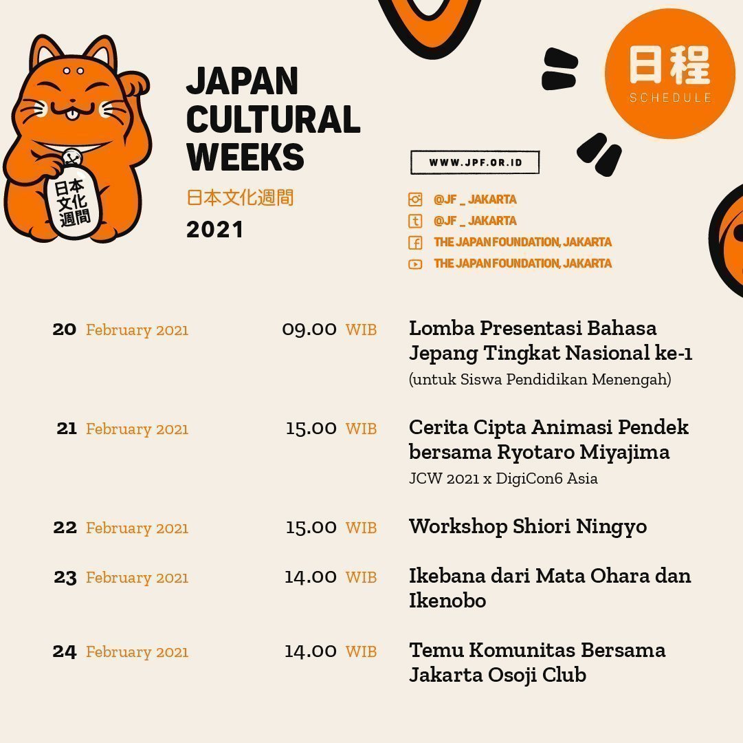 Berbeda dari tahun-tahun sebelumnya, seluruh rangkaian kegiatan Japan Cultural Weeks (JCW) tahun ini hadir dengan konsep daring yang akan diselenggarakan pada 12 – 27 Februari 2021 melalui beberapa platform media sosial milik the Japan Foundation, Jakarta. Beragam kegiatan yang diselenggarakan antara lain demonstrasi Ikebana, Chanoyu, talk tentang animasi, dan diskusi mengenai budaya kerja antara Indonesia dan Jepang.