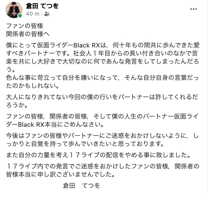 Tetsuo Kurata, aktor asal Jepang di balik seri Kamen Rider Black atau Satria Baja Hitam melayangkan ucapan permohonan maaf kepada para fansnya. Diumumkan melalui media sosial resminya, Tetsuo Kurata menyebutkan bahwa ia sangat menyukai Kamen Rider Black/RX yang sudah dianggap sebagai partnernya sendiri yang telah mendampingi hidupnya selama bertahun-tahun. Karenanya ia sampai tidak habis pikir kenapa ia harus melayangkan pernyataan kontroversial sebelumnya. Ia juga menyebutkan bahwa dirinya saat itu tengah frustasi. Karenanya ia memohon maaf, dan tidak akan membuat masalah lagi.