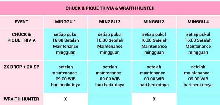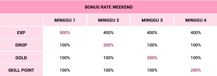 Jangan sampai kamu kelewatan bermain saat akhir pekan! Karena setiap weekend (Jumat-Minggu) kamu akan mendapatkan bonus-bonus tambahan. Bonus yang diberikan pun bervariasi setiap minggunya, seperti bonus EXP, bonus Drop, bonus Gold, dan bonus Poin hingga Dua kali lipat!