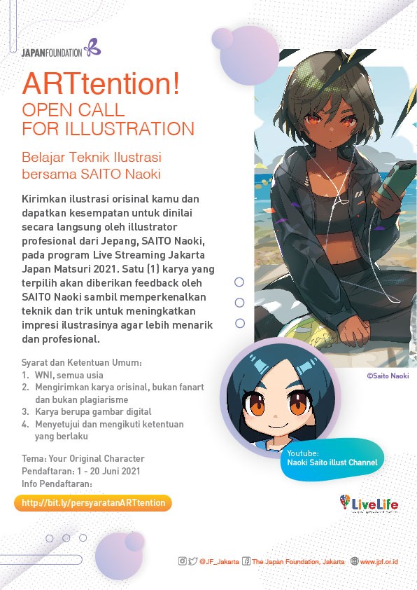 JF Jakarta mengajak para pecinta komik, anime, budaya pop Jepang, maupun ilustrasi dari berbagai kalangan usia di Indonesia untuk berpartisipasi mengirimkan karya ilustrasi orisinal yang dimiliki dan berkesempatan mendapatkan feedback langsung dari Naoki Saito pada acara Live Streaming Jakarta Japan Matsuri 2021.