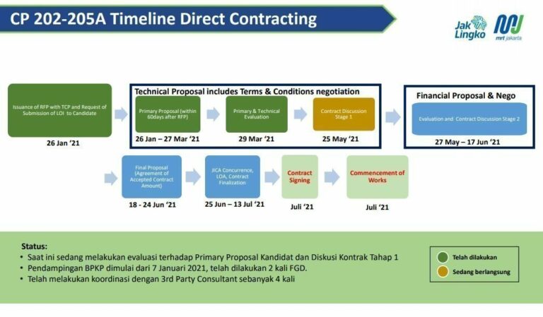 Sementara untuk paket CP202-205A yang berisi pembangunan rute Harmoni – Mangga Besar dan Railway System dari Bundaran HI – Mangga Besar sudah masuk ke dalam Evaluation and Contract Discussion Stage 2. Dan diperkirakan untuk Contract Signing dan Commencement Works pada Juli 2021.