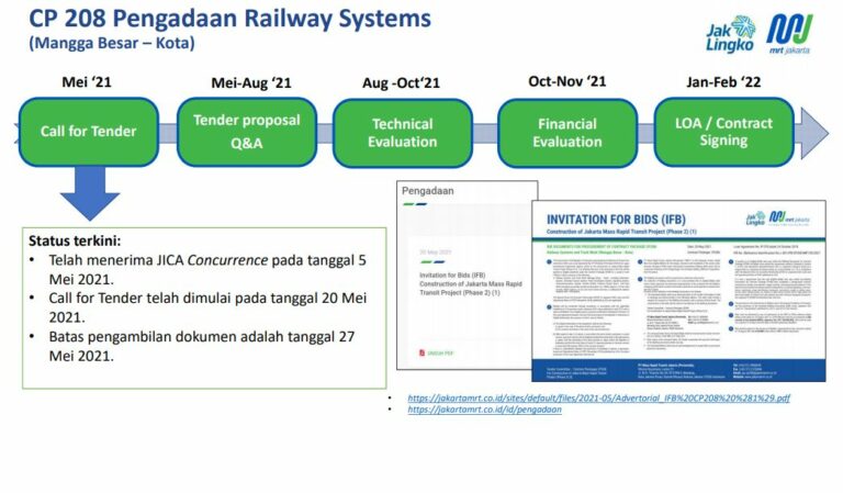 Sementara untuk paket CP208 yakni Railway System dari Mangga Besar – Kota telah memasuki fase Call for Tender. Sementara untuk Contract Signing akan diperkirakan pada Januari/Februari 2022