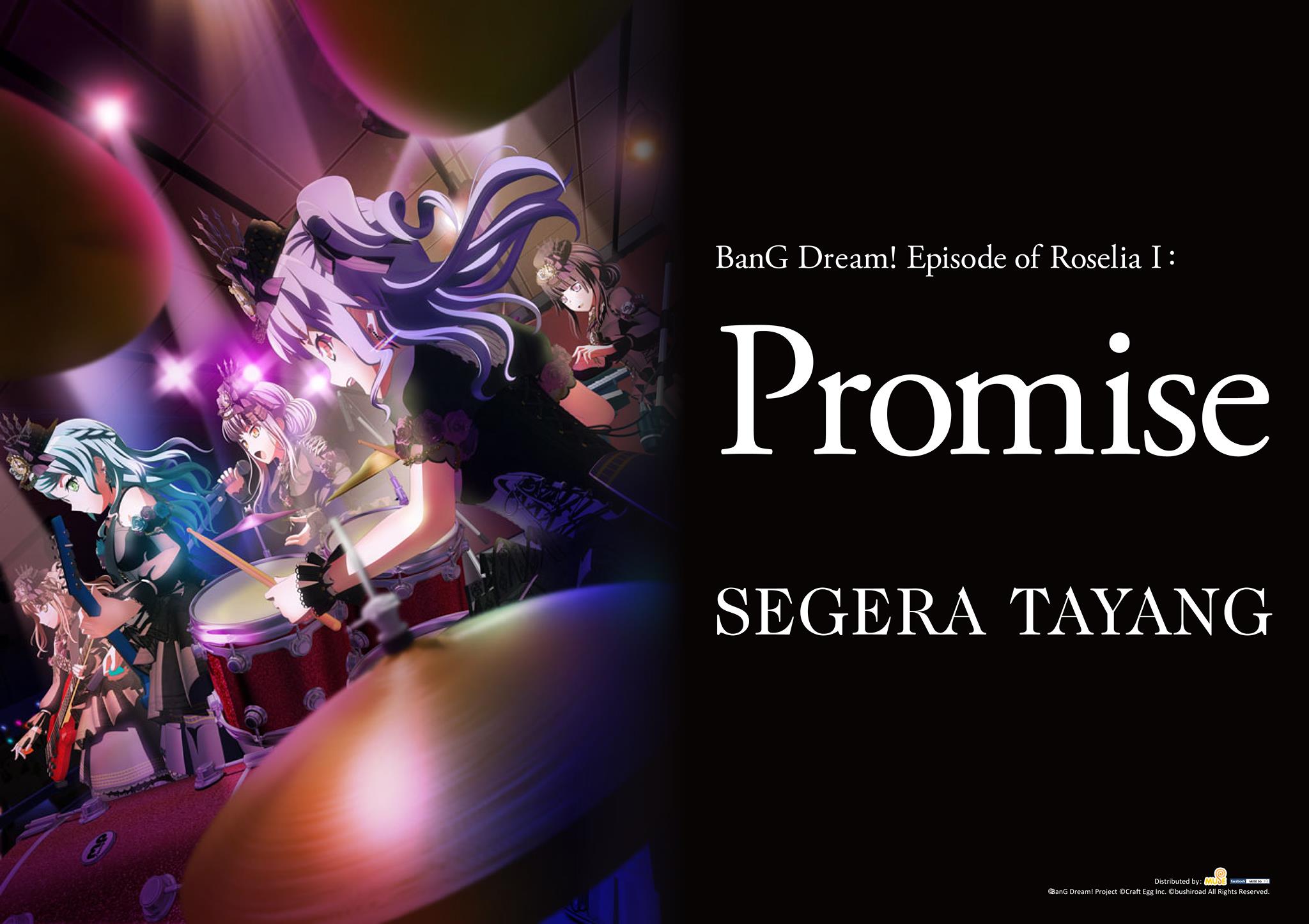 BanG Dream! Episode of Roselia, film layar lebar dari anime BanG Dream! yang dibintangi oleh grup Roselia ini sebagaimana telah diberitakan sebelumnya akan diputar di bioskop-bioskop Indonesia. Kini Muse Indonesia melalui akun media sosialnya telah mengumumkan bahwa film bagian pertama yang berjudul Bang Dream! Episode of Roselia 1: Promise akan ditayangkan di CGV Cinemas Indonesia pada bulan Juli 2021 mendatang. Meskipun begitu, masih belum ada informasi mengenai tanggal berapa film ini akan dirilis di Indonesia. Di Jepang sendiri filmnya telah dirilis pada bulan April 2021 lalu. Bagian kedua dari filmnya sendiri akan dirilis di Jepang pada tanggal 25 Juni 2021 mendatang.