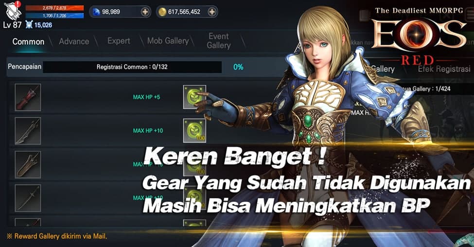 Sistem Gallery pada game MMORPG Paling berbahaya EOS RED dapat mendaftarkan sebuah senjata, armor atau item lainnya agar dapat melihat status tambahan yang tersedia. Jangan terburu – buru untuk menjual atau membongkar item yang kamu dapatkan, pastikan untuk mendaftarkannya ke Gallery terlebih dahulu. Mungkin saja kamu menemukan efek yang bagus sehingga dapat digunakan untuk meningkatkan kekuatan tempur untuk melawan Monster berbahaya di EOS RED.