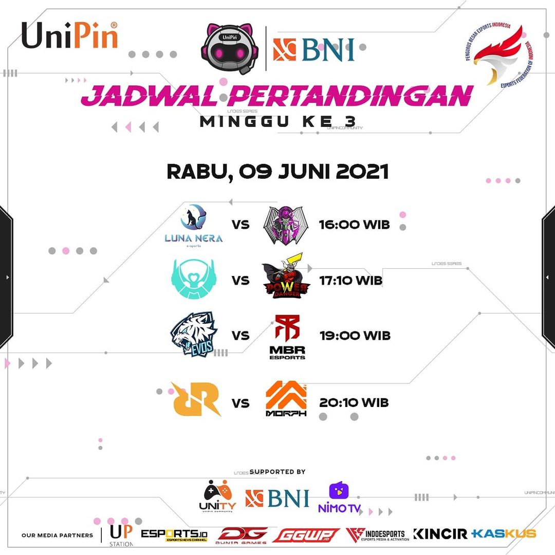 Turnamen esports Mobile Legends: Bang Bang (MLBB) khusus perempuan, Ladies Series MLBB 2021 kian mendekati ujung penyelenggaraan. Setelah melewati minggu kedua regular season pada 2-6 Juni 2021 lalu, hari ini minggu ketiga akan dimulai. Minggu ketiga akan berjalan selama lima hari sejak tanggal 9 Juni 2021 hingga Minggu 13 Juni 2021. Pertandingan hari ini akan dibuka pukul 16.00 secara daring dengan match antara Luna Nera Esports dan 7 Heaven Emerald.