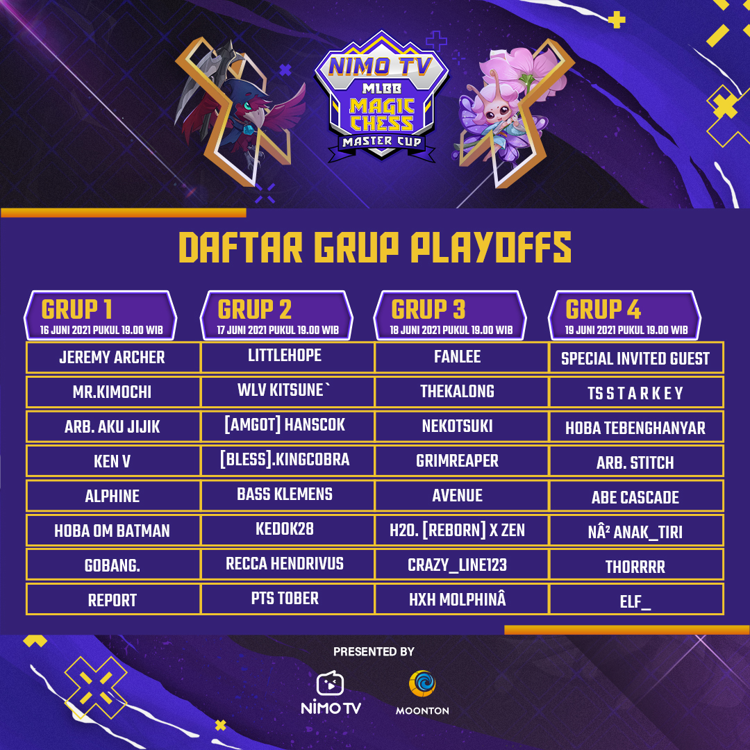 “Kami sangat mengapresiasi dan mendukung Nimo TV X MLBB Magic Chess Master Cup. Ini adalah salah satu bentuk komitmen dari kami dan juga Nimo TV untuk terus berkontribusi dalam membesarkan ekosistem esports di Tanah Air. Bukan cuma itu, kami juga sangat bangga melihat antusiasme para peserta yang akan bertanding nantinya. Jadikan kompetisi ini sebagai pengalaman kalian dalam berkompetisi di dunia esports dan buktikan bahwa generasi muda dapat berprestasi dan berkontribusi untuk masa depan lebih baik,” ujar Azwin Nugraha, Public Relations Manager Esports Moonton Indonesia.