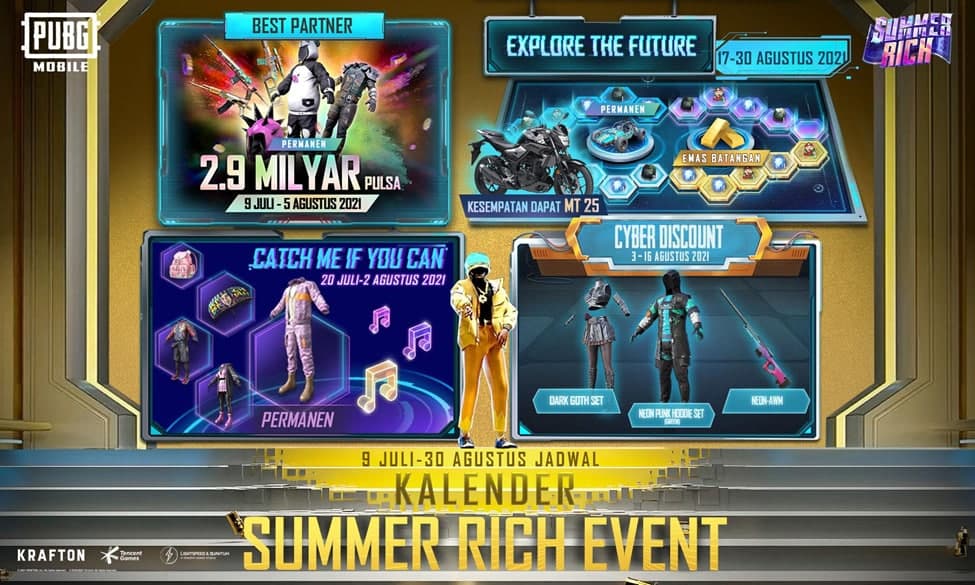 Yuk mainkan game PUBG MOBILE dan ikutan event Summer Rich! Ada beragam event serta hadiah in-game dan nyata yang bisa dimenangkan oleh para pemain dengan cara tertentu. Melalui event Summer Rich, pemain juga bisa jadi kaya dengan memainkan PUBG MOBILE.
