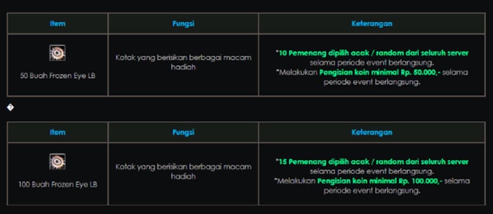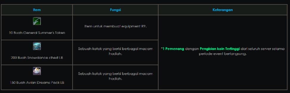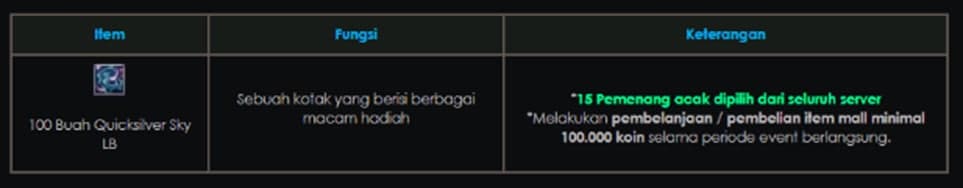 - Hadiah dibagikan kepada karakter yang melakukan pembelanjaan / pembelian item mall selama periode Event.