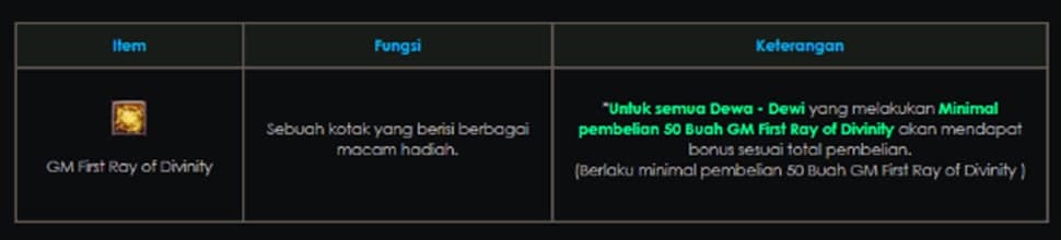 ID A melakukan pembelian GM First Ray of Divinity sebanyak 50 buah, maka ID A akan mendapat bonus tambahan 50 Buah GM First Ray of Divinity