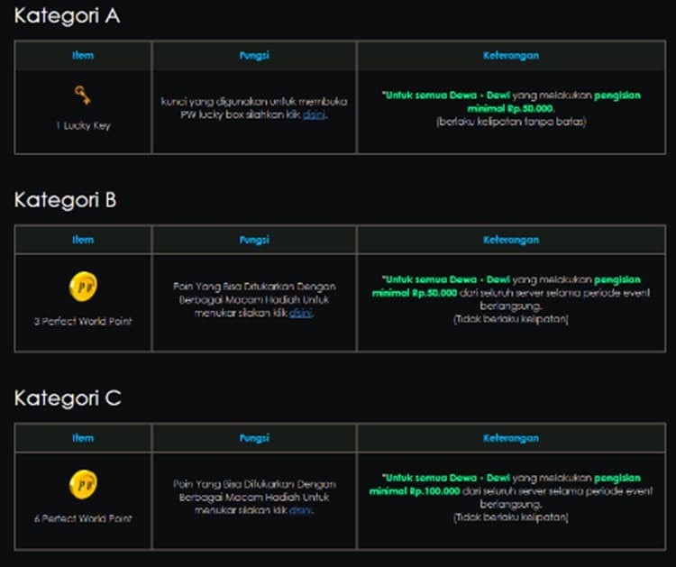 Bagi Dewa-Dewi (panggilan player Perfect World) yang melakukan Pengisian Koin atau pun Pembelanjaan Item Mall sesuai ketentuan selama periode event, maka akan berkesempatan mendapatkan hadiah keren dan juga menarik.