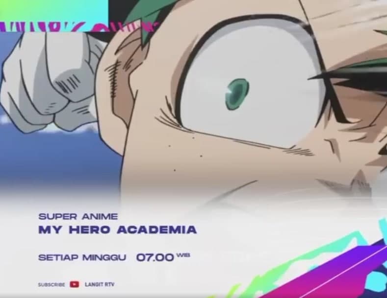 My Hero Academia akhirnya akan tayang lagi di Rajawali Televisi atau RTV. Dikonfirmasi di akun media sosial RTV, anime yang pernah ditayangkan di tahun 2020 lalu ini kini akan ditayangkan kembali mulai tanggal 25 Juli 2021, dan akan ditayangkan setiap hari Minggu pukul 7.00 WIB. RTV sendiri sebelumnya sudah menayangkan anime My Hero Academia hingga 2 season. Meskipun begitu, masih belum ada informasi lebih lanjut apakah mereka nantinya juga akan menayangkan season-season selanjutnya.
