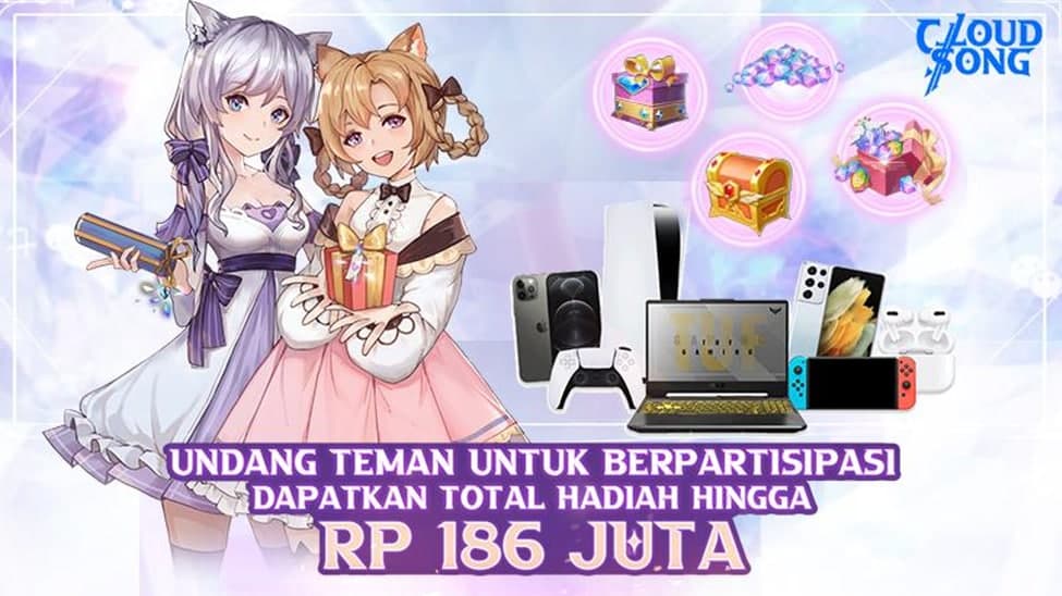 Dapatkan Grand Prize dengan total hadiah Rp186 juta hanya dengan Pra-Registrasi di cloudsong.vnggames.com. Ikuti Event Pra-Registrasi di website, summon sebanyak-banyaknya, dan dapatkan kesempatan untuk meraih hadiah, Iphone 12 Pro Max, Samsung Galaxy S21 Ultra, Airpod Pro, Nintendo Switch, PlayStation, atau Laptop ASUS TUF Gaming F1. Ekslusif untuk wilayah Indonesia, Singapura, Malaysia, Vietnam, Thailand, dan Filipina saja!