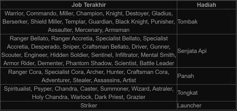 Hadiah Senjata sesuai Job Akhir sebagai berikut:
