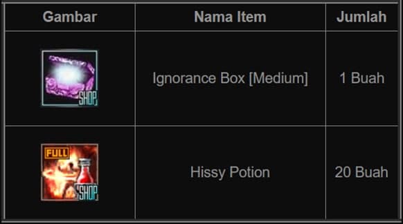 - 1 Buah Senjata Golden +6 Ignorant (Sesuai Job Akhir), Untuk Total 6 Pemenang di Server Zigma