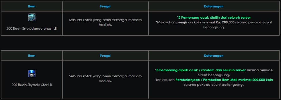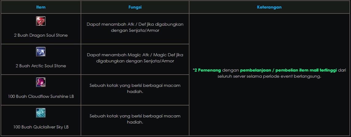- Hadiah dibagikan ke ID yang karakternya melakukan pembelanjaan / pembelian Sesuai ketentuan Event selama periode Event.