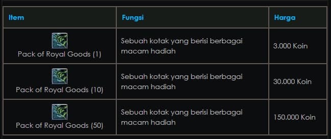 Berikut hadiah yang ada di dalam Pack of Royal Goods: