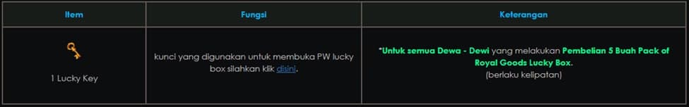 - Setiap ID yang melakukan pembelian 5 Buah Pack of Royal Goods Lucky Box akan mendapat hadiah langusung berupa 1 Lucky Key (berlaku kelipatan)