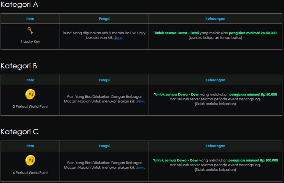 Selain itu Hadiah Langsung, Tim Perfect World pun menyiapkan hadiah undian untuk para player yang semangat mengikuti event tersebut.