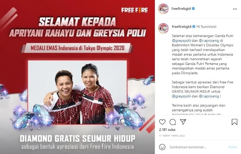 Sebagai bentuk apresiasi atas keberhasilan Greysia Polii dan Apriyani Rahayu yang telah menyumbangkan medali emas pada cabang bulu tangkis di Olimpiade 2020, Garena Indonesia memberikan Diamond Free Fire gratis seumur hidup kepada kedua pasangan atlet tersebut. Apresiasi tersebut diungkapkan lewat sebuah postingan pada akun Instagram resmi Garena FreeFire Indonesia.