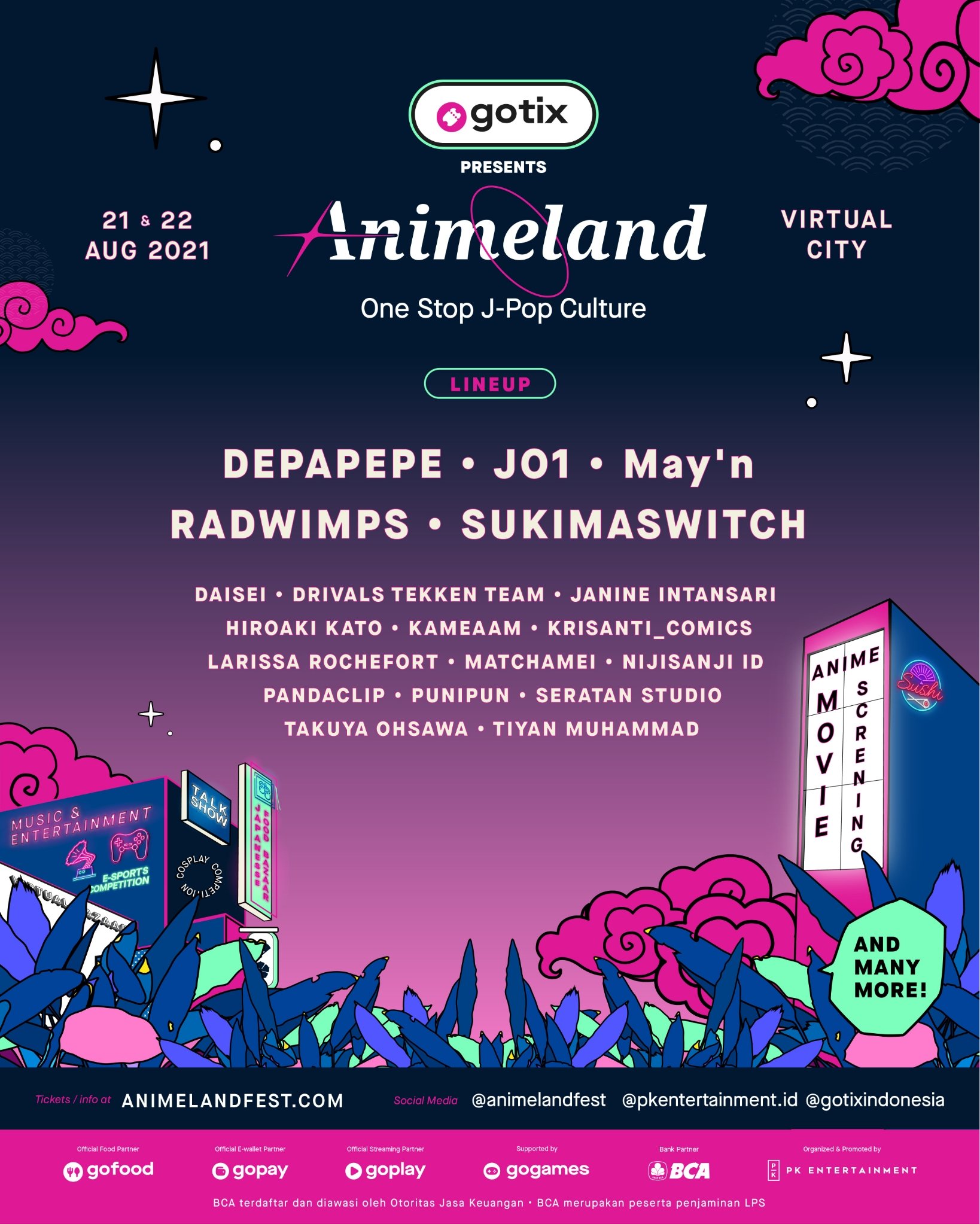 Di event Animeland nanti, pengunjung akan disuguhi beberapa performance musik, cosplay dan tentunya vtuber. Event Animeland bakal kehadiran banyak artis seperti duo acoustic Depapepe, boyband JO1, dan juga duo fusion pembawa lagu jingle BINTANG SMA Pocari Sweat yaitu Sukima Switch. Ada pula May’n yang menjadi diva-nya lagu-lagu anisong, grup band RADWIMPS yang terkenal akan lagu-lagunya yang muncul di anime Makoto Shinkai seperti Kimi no Na Wa dan Tenki no Ko serta mencetak banyak hits, dan musisi Jepang yang berkiprah di Indonesia Hiroaki Kato turut meramaikan event ini.