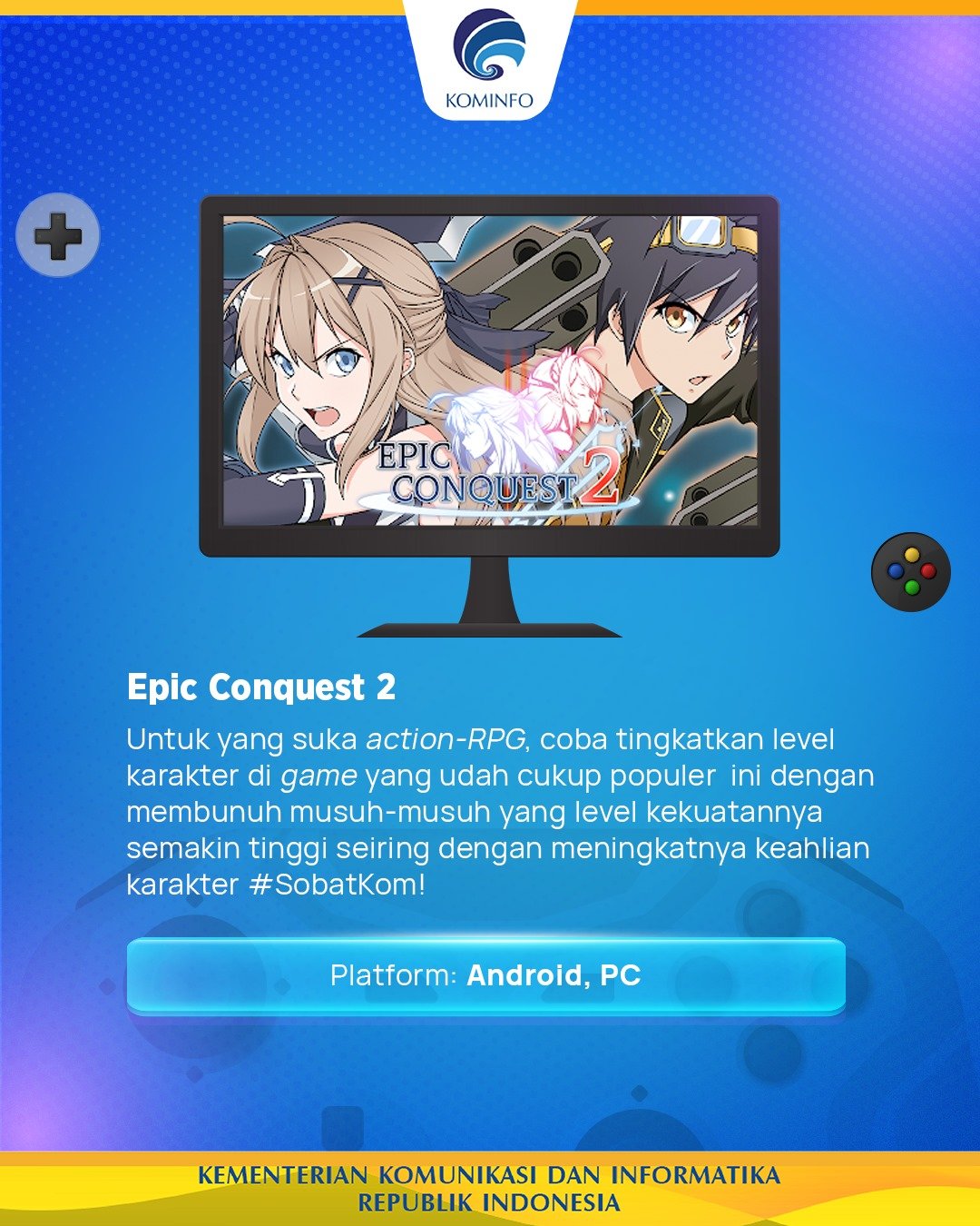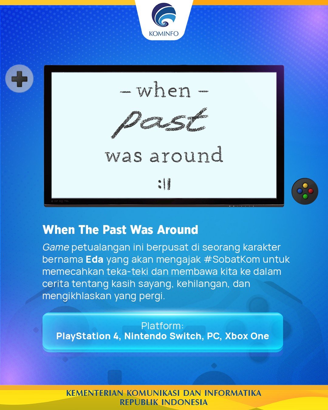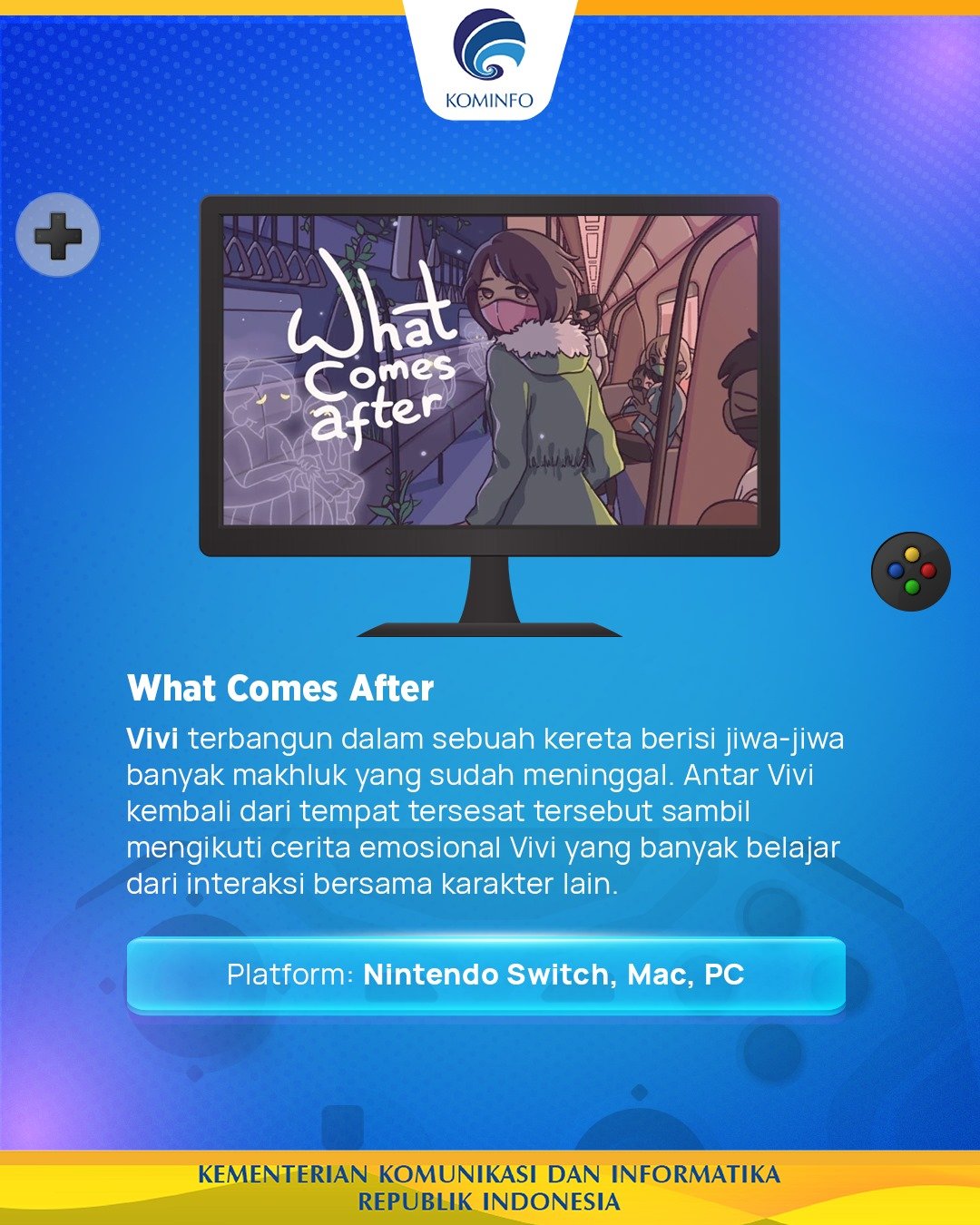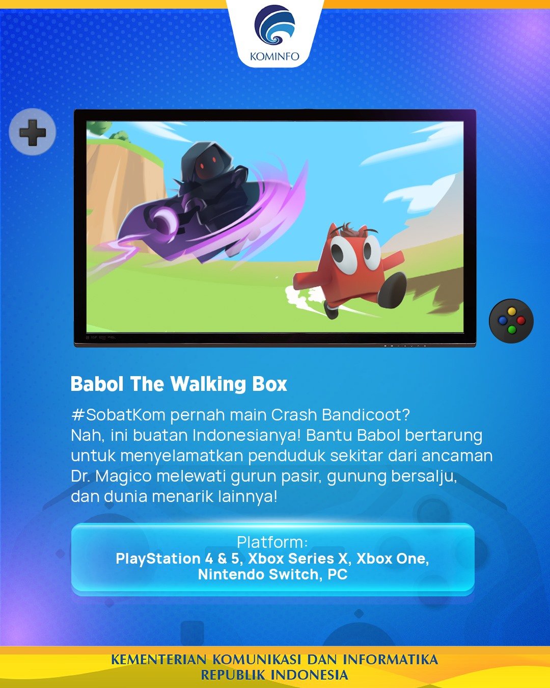 Industri game Indonesia terus bertumbuh dan berkembang. Berbagai game-game karya pengembang anak negeri terus bermunculan di berbagai platform, baik game sederhana yang bisa diunduh di HP sampai game petualangan seru yang bisa dimainkan di PC, Xbox, PlayStation, dan lain sebagainya. Kini Kementerian Komunikasi dan Informatika RI (Kominfo) melalui akun Facebooknya sempat memberikan 5 rekomendasi game Indonesia untuk dimainkan. Inilah game-game tersebut: