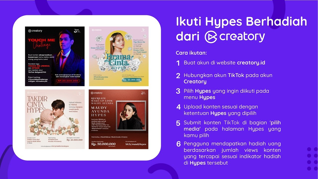Sejak diluncurkan, Creatory Hypes telah mengadakan puluhan Creatory Hypes (Interactive challenge viral dan berhadiah) yang diikuti oleh ribuan content creator di Tiktok. Creatory pun dipercaya oleh berbagai brand dan creator untuk menciptakan Creatory Hypes bagi produk mereka, salah satunya dengan Trinity Optima Production, di mana Creatory dipercaya untuk membantu mengenalkan lagu dari musisi – musisi ternama kebanggaan Indonesia dalam naungan label Trinity Optima Production ke publik, termasuk Maudy Ayunda, Rizky Billar dan masih banyak lagi. Tidak ketinggalan juga, “Touch Me” sebuah lagu kolaborasi internasional terbaru dari Afgan juga akan mewarnai hypes spesial terbaru yang ada di Creatory. Hypes spesial ini mulai bisa diikuti dari tanggal 22 September 2021 pada halaman hypes di Creatory.