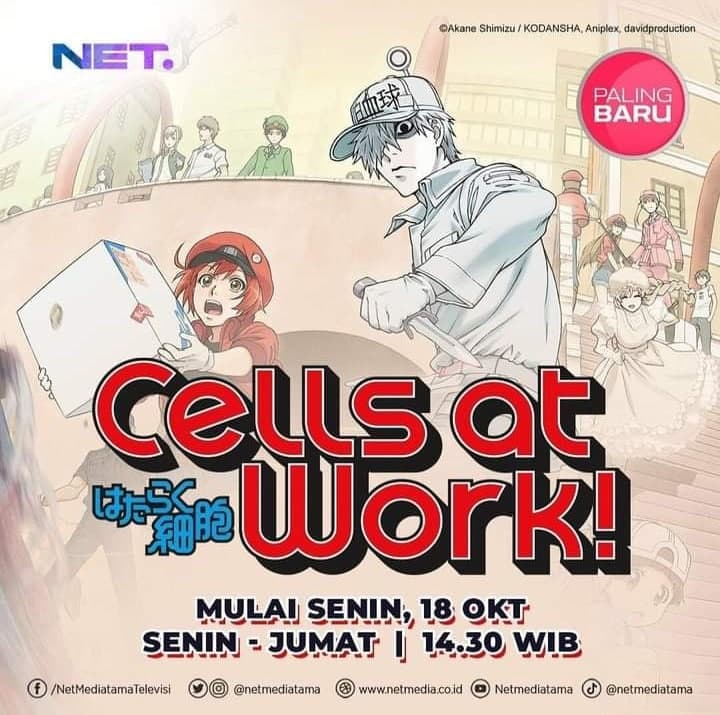 Hataraku Saibou!, anime yang berkisah mengenai personifikasi dari cara kerja sel tubuh manusia ini sebagaimana telah diberitakan sebelumnya, rencananya akan tayang di Indonesia. Adalah saluran televisi NET Mediatama Televisi atau NET yang akan menayangkannya mulai hari Senin, tanggal 18 Oktober 2021, pada pukul 14.30 WIB, dengan judul Cells at Work! Selain itu diumumkan juga bahwa anime ini akan ditayangkan setiap hari Senin sampai Jumat.