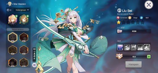 Liu Bei merupakan salah satu War Maiden paling langka di game Dawn of Dynasty dengan senjata pedang yang dimilikinya. War Maiden Liu Bei memiliki talent merah command, talent kuning siege, dan talent biru skill yang mana talent ini adalah sistem buff yang dimilikinya.