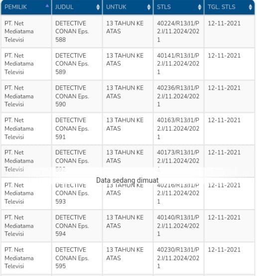 Anime Detektif Conan saat ini tengah ditayangkan secara rutin di stasiun televisi NET. Detektif Conan saat ini ditayangkan setiap hari Senin sampai Jumat pukul 12.30 WIB. Selain itu di situs resminya, anime ini juga dipastikan masih tetap turut ditayangkan di hari Sabtu dan Minggu, pada pukul 07.30 WIB. Kini di pertengahan bulan November 2021, terungkap bahwa NET akan kembali menambah jumlah episode terbarunya. Berdasarkan informasi terkini dari Lembaga Sensor Film (LSF), tampak episode 588 hingga 595 telah terdaftar untuk lulus sensor.