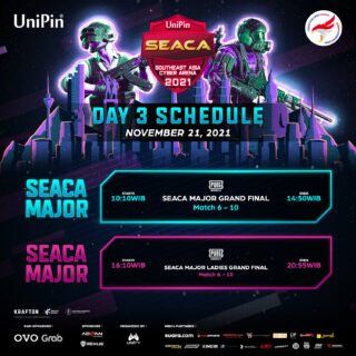 Acara puncak dari seri penyelenggaraan UniPin SEACA 2021, SEACA MAJOR 2021 dibuka hari Jumat, 19/11 pukul 10.20 WIB. Setelah dimulai sejak tanggal 12 November dengan rangkaian webinar dan turnamen MLBB, Ladies SEA Invitational, SEACA MAJOR 2021 akan menjadi laga PUBG Mobile (PUBGM) penentuan bagi 32 tim esports terkuat dari Asia Tenggara. SEACA MAJOR 2021 terselenggara selama 3 hari hingga Minggu, 21 November 2021.