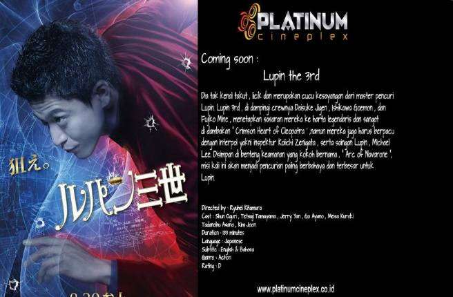 Setelah sebelumnya diputar melalui jaringan bioskop Blitzmegaplex, film adaptasi Live Action dari komik Lupin III kini akan segera diputar di Cibinong, Solo, Sidoarjo dan Magelang melalui jaringan bioskop Platinum Cineplex. Berdasarkan jawaban dari pihak Encore Films, jika tidak ada halangan maka film ini akan mulai diputar pada 26 November 2014.