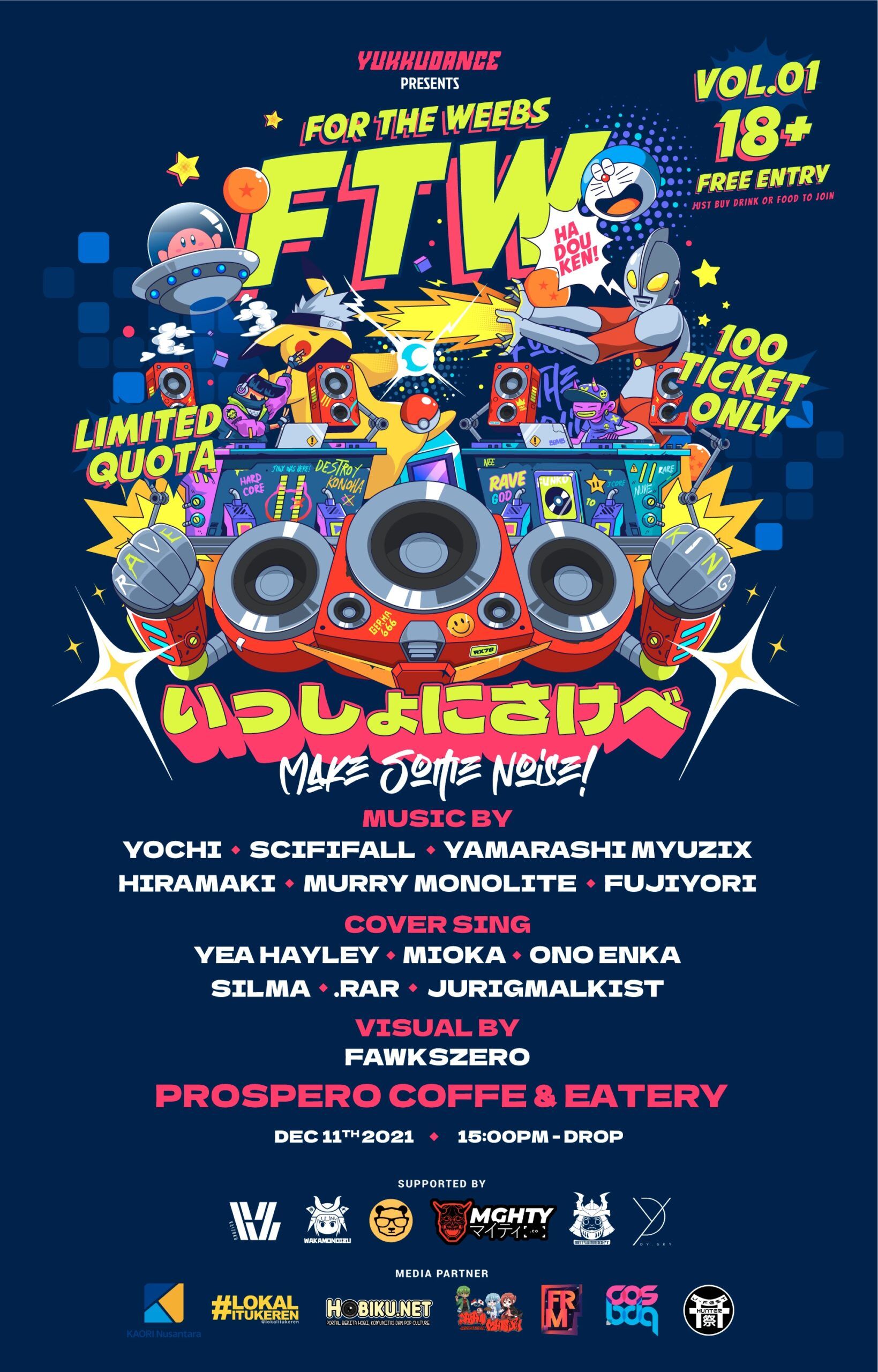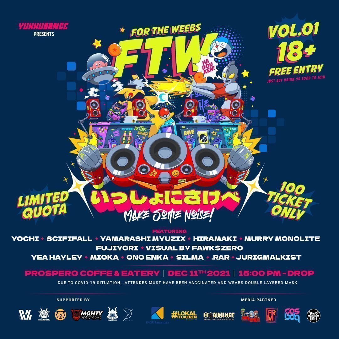Tidak sampai di situ, semua kaula akan dimanjakan oleh hingar bingarnya VJ (Visual Jockey) oleh FAWKSZERO yang tidak kalah keren, namun tetap tak lupa kami pun menerapkan Protokol Kesehatan COVID-19 untuk kebaikan bersama. FOR THE WEEBS akan hadir pada tanggal 11 Desember 2021 bertempat di Prospero Cafe & Eatery, Jl. Cikapundung River Spot Kota Bandung, Mulai Pukul 15.00 – 21:00 WIB.