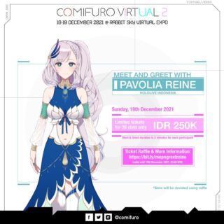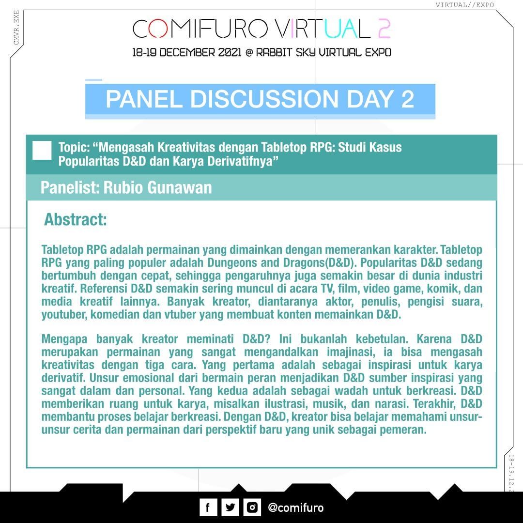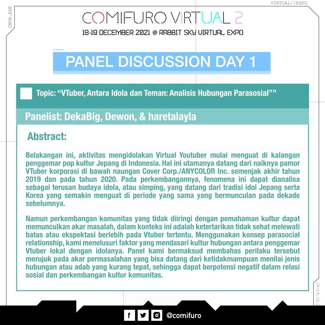 Sesi Diskusi Panel kembali hadir di Comivuro 2 dengan kehadiran dua panelis yang telah terpilih berdasarkan proses seleksi yang telah dijalankan. Panelist pertama yang akan membawakan diskusi di hari Sabtu, 18 Desember 2021 adalah DekaBig, Dewon dan haretalayla. Tema diskusi yang dibawakan adalah “VTuber, Antara Idola dan Teman: Analisis Hubungan Parasosial”. Panelist kedua yang akan membawakan diskusi di hari Minggu, 19 Desember 2021 adalah Rubio Gunawan dengan topik diskusi “Mengasah Kreativitas dengan Tabletop RPG: Studi Kasus Popularitas D&D di Dunia Industri Kreatif”. Kedua sesi Diskusi Panel ini akan diselenggarakan di jam 13:00-14:00 WIB.