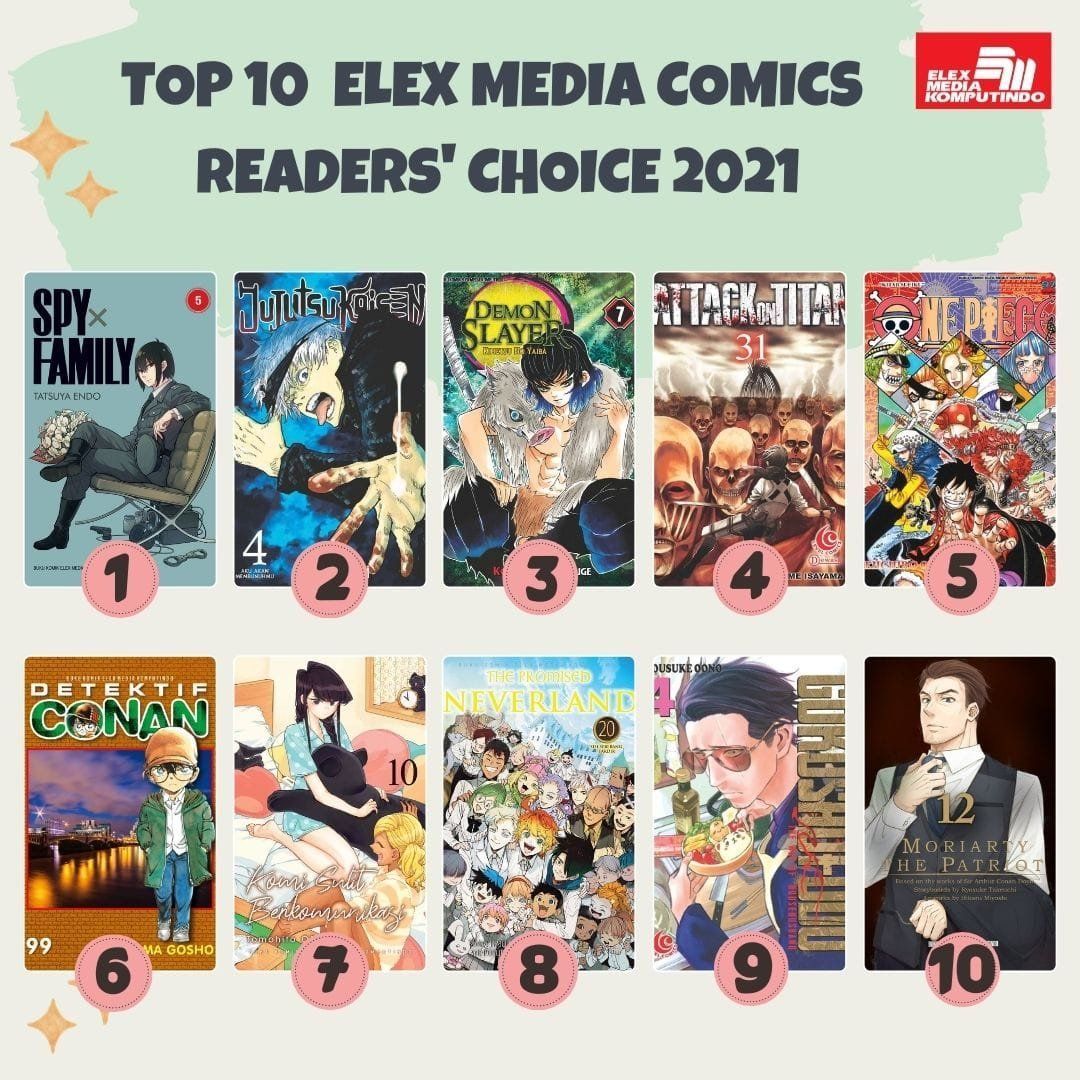Di penghujung tahun 2021 ini penerbit Elex Media telah memublikasikan daftar 10 komik pilihan pembacanya selama tahun 2021 ini. Inilah 10 komik pilihan pembaca Elex Media selama tahun 2021: