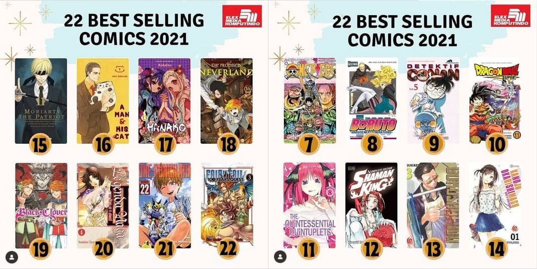 Melalui akun media sosialnya, penerbit Elex Media Komputindo telah memublikasikan judul-judul komik best seller terbitan mereka selama tahun 2021. Inilah komik-komik Best Seller Elex Media 2021: