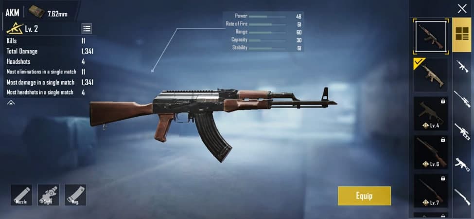 Pada dasarnya, AKM adalah senjata yang cocok untuk jarak dekat sehingga penggunaan scope tidak terlalu dibutuhkan. Gunakanlah scope yang tidak memperbesar ukuran target seperti Red Dot Sight.