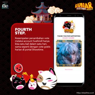 Tepat hari Rabu (16/02), pukul 19.00 WIB, registrasi event telah ditutup. Kini, Showtime Lunar Festival 2022 masuk periode VOTING! Berikan LOVE kepada peserta favoritmu yang akan menjadi kriteria penilaian pemenang pada event ini.