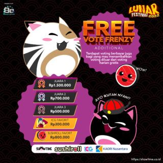 Jumlah voting LOVE kalian akan menentukan siapa cosplayer terfavorit di Showtime Lunar Festival 2022. Selain tiga pemenang hasil voting event, ada dua pemenang lainnya dari pilihan favorit dari IndoCosuGram (ICG) dan Sushiroll.