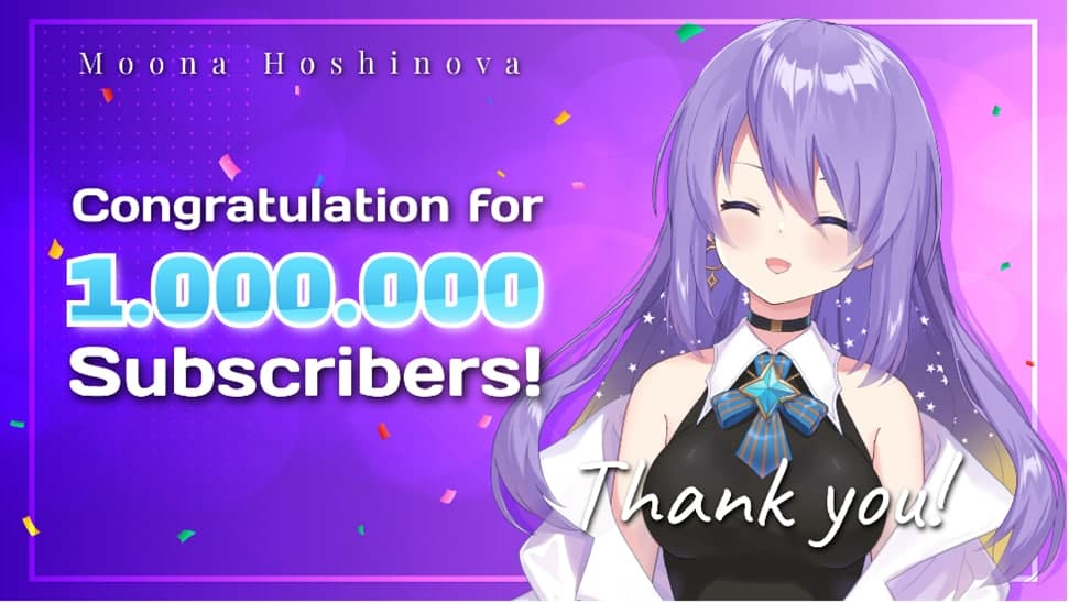 Berita terbaru, ada kabar gembira sekaligus membanggakan untuk para penggemar Virtual YouTuber! di Indonesia, pada hari Selasa, 22 February 2022. Moona Hoshinova dari hololive Indonesia akhirnya resmi menjadi Virtual YouTuber di Indonesia pertama yang menembus angka 1 juta subscribers. Moona juga merupakan VTuber dengan subscriber terbanyak di dunia nomor 30 saat ini, dan merupakan yang nomor 1 di Indonesia dan juga Asia Tenggara. Moona adalah anggota hololive Indonesia (VTuber group di bawah naungan hololive production, yang memiliki lebih dari 60 juta fans di seluruh dunia), generasi pertama dengan debut perdananya yang dirilis pada 11 April 2020. Ia tak hanya memiliki banyak fans dari Indonesia saja, tapi juga dari mancanegara seperti Jepang dan negara-negara berbahasa Inggris di Asia, Amerika dan Eropa.