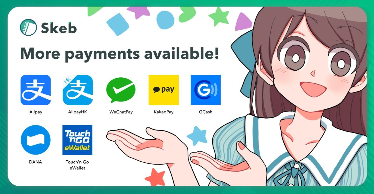 Skeb menerima berbagai jenis pembayaran yaitu menggunakan kartu debit, kredit, maupun Alipay. Secara umum kartu yang bisa kalian gunakan di Skeb adalah kartu yang termasuk jaringan VISA, Mastercard, JCB, American Express, dan Discover. Tidak punya kartu? Tenang saja karena Skeb menerima Alipay, yang memungkinkan kalian untuk bertransaksi menggunakan DANA. Untuk dapat menggunakan DANA, kalian perlu membeli uang khusus yang bernama Skeb Poin. 1 Skeb Poin bernilai 1 Yen, sehingga tidak perlu repot untuk menghitung kembali uang yang kalian miliki. Perlu kalian ingat juga bahwa poin ini memiliki kadaluarsa sejak kalian membeli poin.