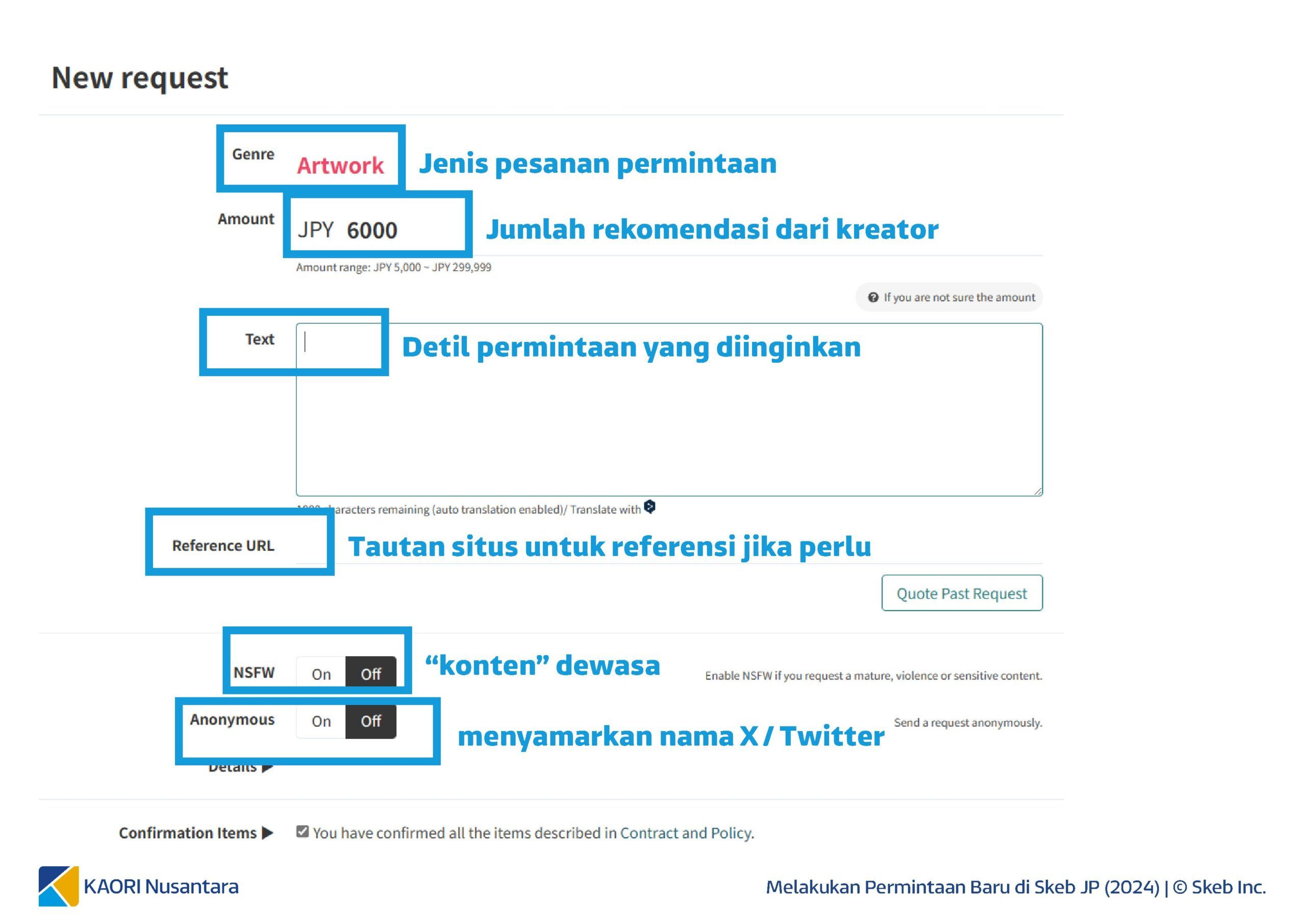 Sebelum lanjut untuk mengirimkan permintaanmu, perlu kalian ingat kalau Skeb itu berbeda dengan layanan lainnya. Hal ini karena Skeb melarang adanya komunikasi di luar Skeb. Sehingga ketika kalian mengirimkan permintaan, harap kalian tulis dengan jelas dan detil. Serta dengan adanya larangan tersebut, permintaan kalian sendiri tidak terlalu berbeda dengan “gacha”, karena tidak ada revisi ataupun laporan progres.