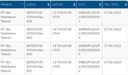 Detektif Conan saat ini tengah ditayangkan secara rutin di stasiun televisi NET. Anime ini saat ini ditayangkan setiap hari Sabtu dan Minggu, pada pukul 07.30 WIB. Sebelumnya sempat terungkap bahwa NET diberitakan kembali menambah jumlah episode terbaru dari episode 622 hingga 635. Kini data melalui Lembaga Sensor Film (LSF), terungkap NET telah resmi mendaftarkan episode Detektif Conan dari 615-639, atau dalam episode asli Jepangnya adalah episode 564-588 dengan status lulus sensor per-tanggal 27 April 2022. Episode-episode baru tersebut telah siap untuk ditayangkan oleh NET sewaktu-waktu. NET juga sempat dikabarkan akan menayangkan 5 judul film layar lebar Conan. Meskipun begitu, masih belum ada kelanjutan informasi lebih lanjut akan hal ini.
