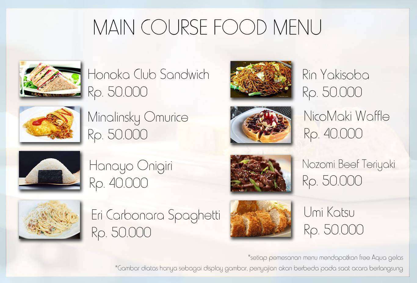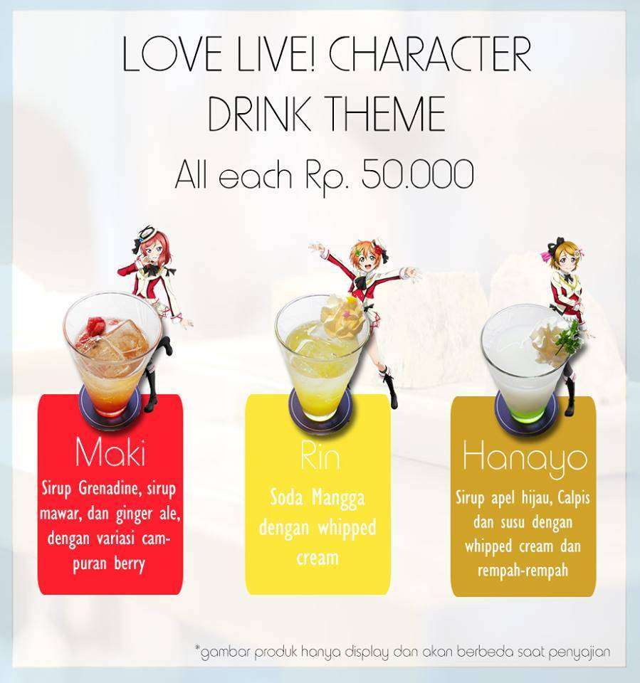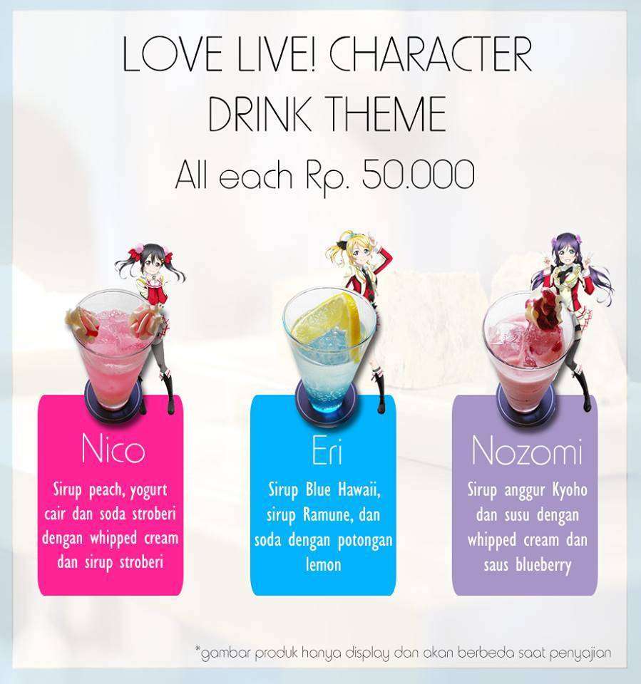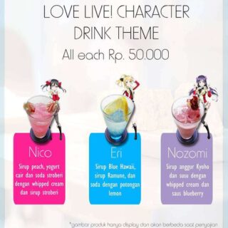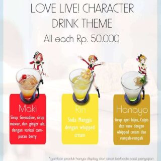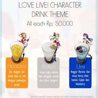 Selain informasi mengenai reservasi tempat, pihak STARMUSE baru saja mengumumkan menu makanan dan minuman yang dapat dipesan di maid cafe ini. Menariknya, berbagai menu yang ada di maid cafe ini bercirikan masing-masing karakter yang tergabung dalam grup idol u’s dalam seri Love Live! Berikut adalah menu maid cafe Love Live! STARMUSE Idol Project: