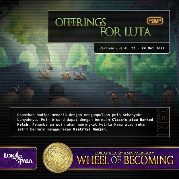 Lokapala juga membuat event untuk menyambut Ksatriya baru ini dengan tajuk Offerings For Luta – Limited Time Event yang berlangsung dari tanggal 11-24 Mei 2022 serta tambahan waktu dari 25-27 Mei 2022 untuk menukar pelangkang dari event tersebut.