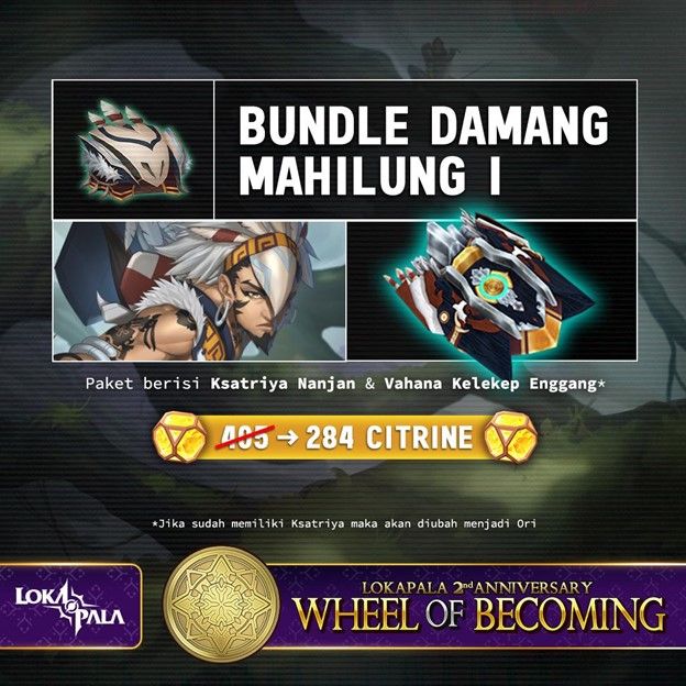 Pemain juga bisa mendapatkan bundle Damang Mahilung 1 yang berisi Ksatriya Nanjan dan Vahana Kelekep Enggang dengan harga 284 Citrine.