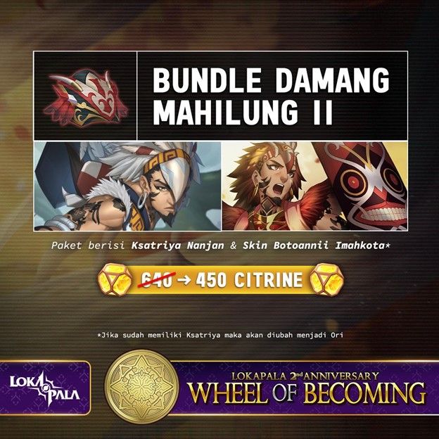 Selain itu, pemain juga bisa mendapatkan bundle Damang Mahilung II yang berisi Ksatriya Nanjan dan Skin Ksatriya Nanjan – Botoannii Imahkota dengan harga 450 Citrine.