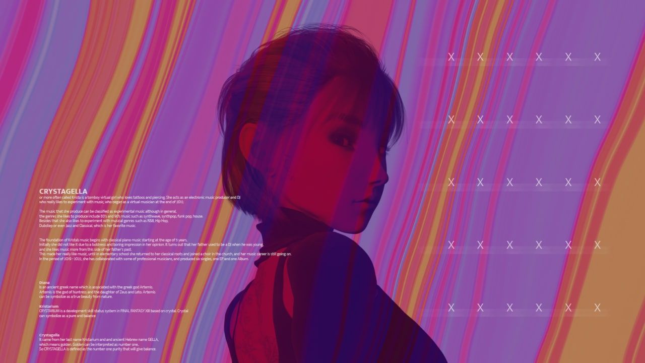 Crystagella atau biasa dipanggil dengan Krista adalah karakter virtual perempuan campuran Indonesia-Jepang yang telah mulai membuat musik dari tahun 2012. Ia berperan sebagai electronic music producer dan disc jockey (DJ) yang gemar bereksperimen dengan suara dan musik. Musik yang dibuat oleh dirinya tergolong kedalam experimental music, tetapi secara umum, genre yang dibuatnya meliputi musik-musik 80’s dan 90’s seperti synthwave, synthpop, disco, nu-disco, funk pop dan house. Crystagella telah berkolaborasi dengan musisi ternama di Indonesia yaitu di single “Raison D’Etre” dengan Dea Dalila yang merupakan mantan personil Hivi dan Kay Oscar lewat single “M.E.I.” dengan menggabungkan konsep virtual dengan musik yang dapat dinikmati oleh khalayak ramai, Crystagella siap membuat terobosan baru di dunia musik.