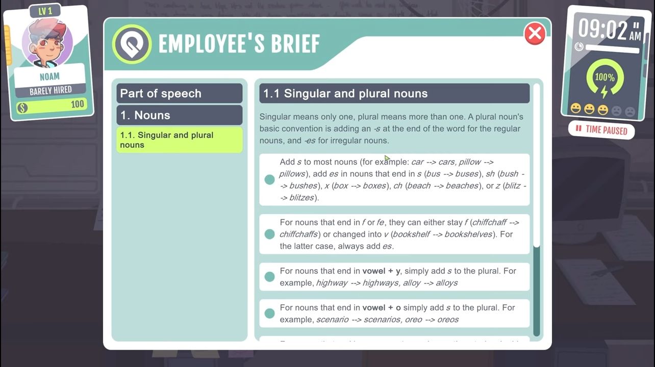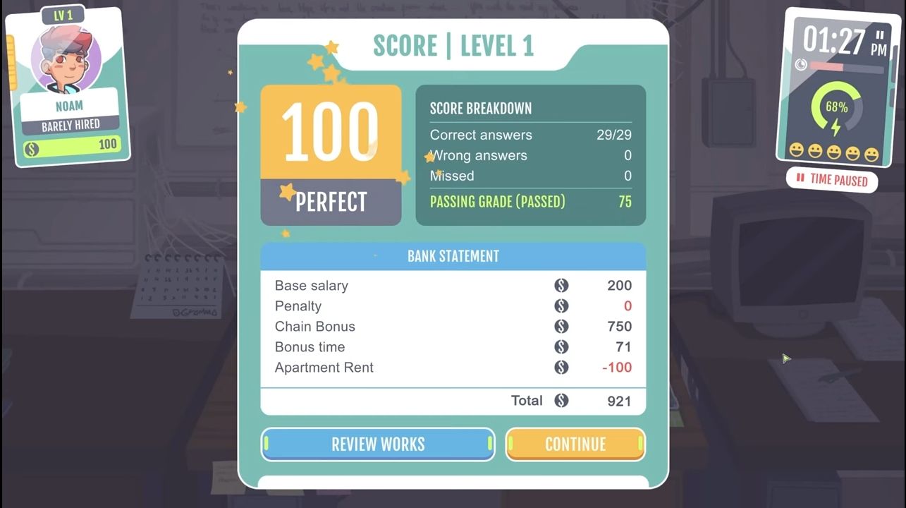 Pemain bisa menyelesaikan tugasnya dan akan ada skor sekaligus gaji yang didapatkan. Jika dirasa kurang puas dengan skor yang dimiliki, pemain juga bisa melihat kata-kata yang salah di hasil tersebut melalui fitur Review Works.