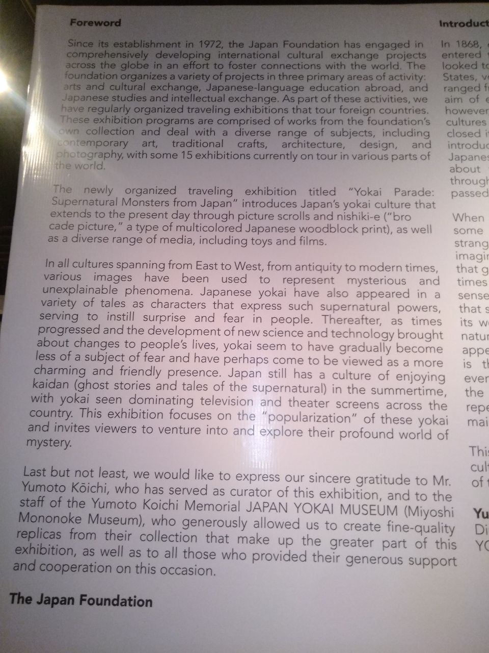 Pada tanggal 16 hingga 27 Juni 2022 lalu Japan Foundation bekerjasama dengan Bentara Budaya Jakarta dan Museum Yokai Jepang Museum Miyoshi Mononoke) menggelar pameran bertajuk Yokai Parade: Supernatural Monsters from Japan. Dalam acara Yokai Parade ini dipamerkan berbagai budaya per-Yokai-an di Jepang dari masa ke masa dengan berbagai medianya masing-masing. Publik diajak melihat bagaimana masyarakat Jepang memandang Yokai melalui berbagai media dari masa ke masa, seperti gulungan gambar, nishiki-e (cetak balok kayu berwarna), hingga media film dan mainan.